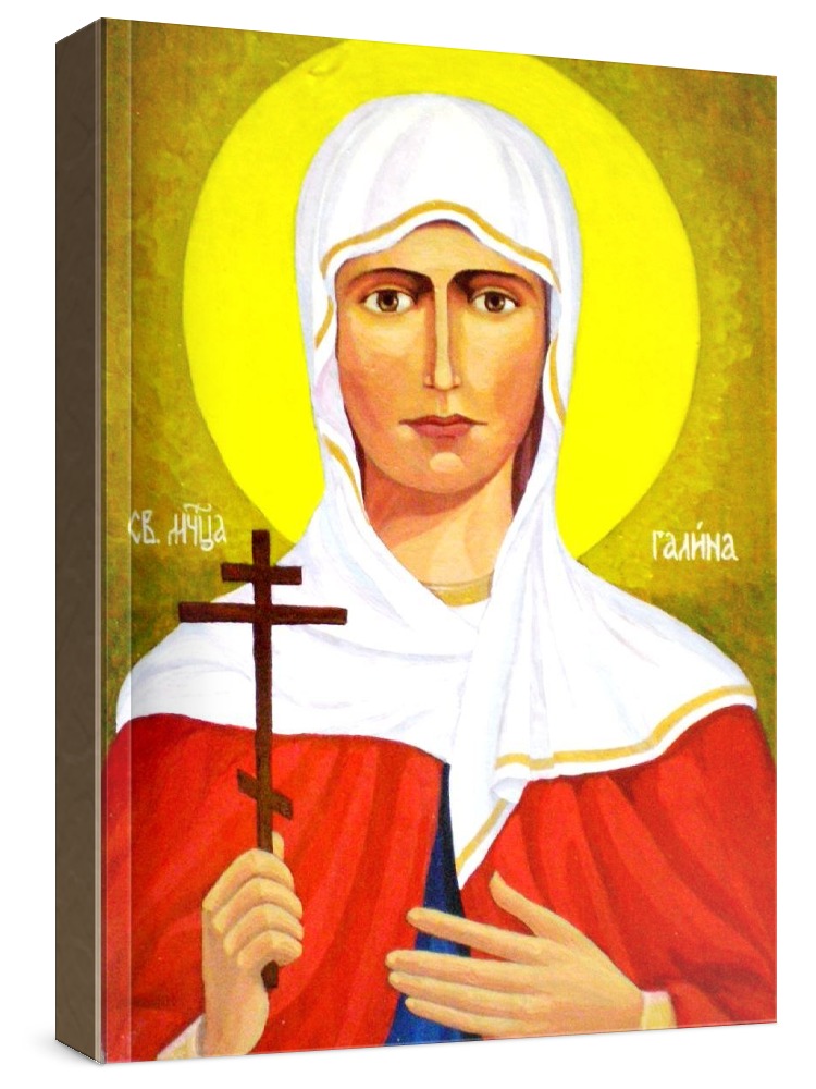 Галина коринфская (икона на дереве). Икона на заказ. Срок изготовления - 5-14 дней. Изображение нанесено на основу из натурального хвойного дерева методом прямой печати (не полиграфия). Деревянная основа иконы подвержена искусственному старению. Лик покрыт специальным лаком, что защищает икону от воздействий окружающей среды и обеспечивает хранение иконы в первозданном виде в течение нескольких десятилетий. Цена зависит от размера иконы (высота может незначительно отличаться от указанной величины в связи с точным соблюдением пропорций образца-оригинала): 10x13 - 1500 руб. 30x40 - 5000 руб. 60x80 - 15000 руб. 15x18 - 2250 руб. 40x60 - 8000 руб. 80x120 - 20000 руб. 20x25 - 3000 руб.