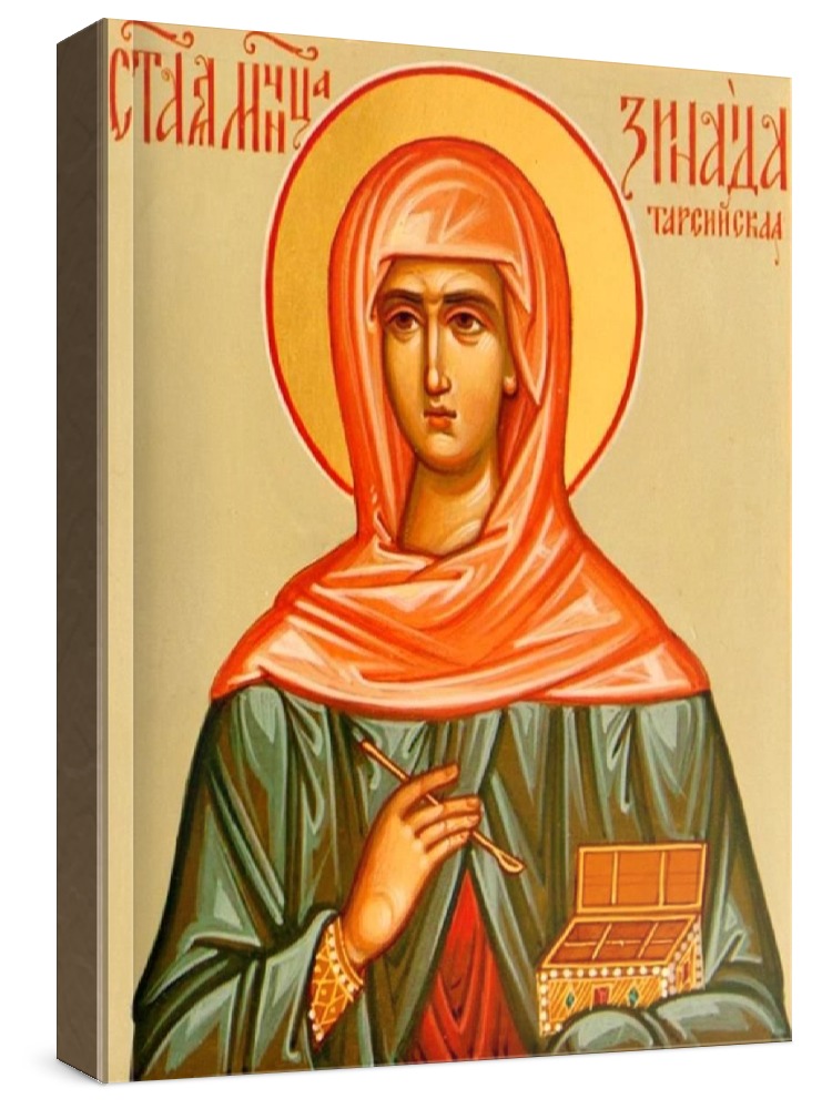 Зинаида тарсийская (икона на дереве). Икона на заказ. Срок изготовления - 5-14 дней. Изображение нанесено на основу из натурального хвойного дерева методом прямой печати (не полиграфия). Деревянная основа иконы подвержена искусственному старению. Лик покрыт специальным лаком, что защищает икону от воздействий окружающей среды и обеспечивает хранение иконы в первозданном виде в течение нескольких десятилетий. Цена зависит от размера иконы (высота может незначительно отличаться от указанной величины в связи с точным соблюдением пропорций образца-оригинала): 10x13 - 1500 руб. 30x40 - 5000 руб. 60x80 - 15000 руб. 15x18 - 2250 руб. 40x60 - 8000 руб. 80x120 - 20000 руб. 20x25 - 3000 руб.