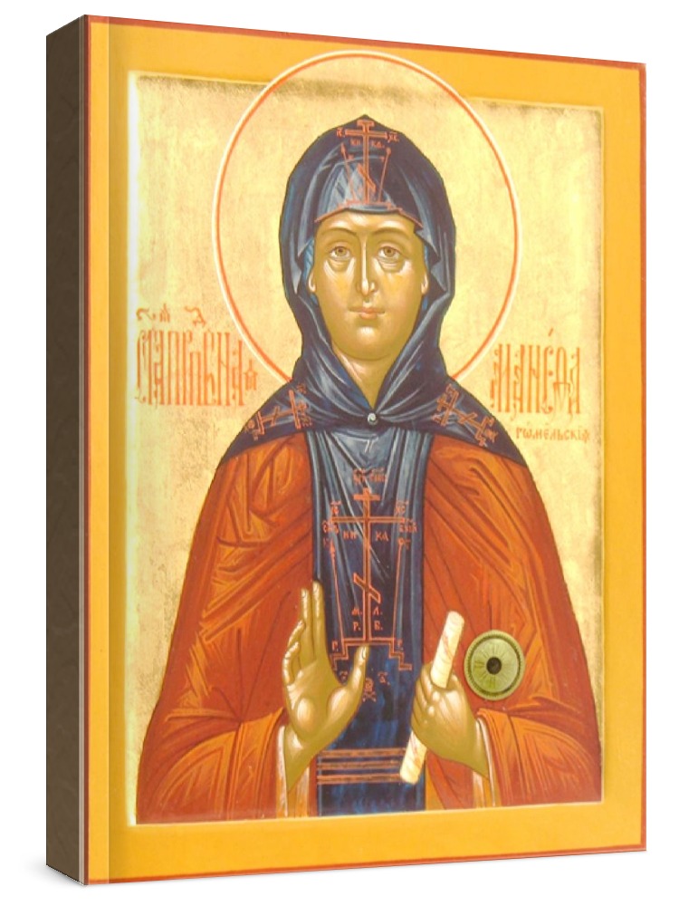 Манефа гомельская (икона на дереве). Икона на заказ. Срок изготовления - 5-14 дней. Изображение нанесено на основу из натурального хвойного дерева методом прямой печати (не полиграфия). Деревянная основа иконы подвержена искусственному старению. Лик покрыт специальным лаком, что защищает икону от воздействий окружающей среды и обеспечивает хранение иконы в первозданном виде в течение нескольких десятилетий. Цена зависит от размера иконы (высота может незначительно отличаться от указанной величины в связи с точным соблюдением пропорций образца-оригинала): 10x13 - 1500 руб. 30x40 - 5000 руб. 60x80 - 15000 руб. 15x18 - 2250 руб. 40x60 - 8000 руб. 80x120 - 20000 руб. 20x25 - 3000 руб.