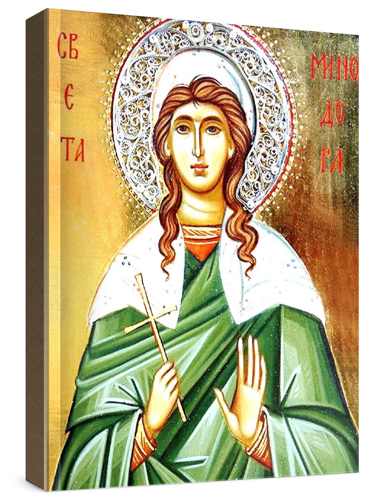 Минодора вифинская (икона на дереве). Икона на заказ. Срок изготовления - 5-14 дней. Изображение нанесено на основу из натурального хвойного дерева методом прямой печати (не полиграфия). Деревянная основа иконы подвержена искусственному старению. Лик покрыт специальным лаком, что защищает икону от воздействий окружающей среды и обеспечивает хранение иконы в первозданном виде в течение нескольких десятилетий. Цена зависит от размера иконы (высота может незначительно отличаться от указанной величины в связи с точным соблюдением пропорций образца-оригинала): 10x13 - 1500 руб. 30x40 - 5000 руб. 60x80 - 15000 руб. 15x18 - 2250 руб. 40x60 - 8000 руб. 80x120 - 20000 руб. 20x25 - 3000 руб.