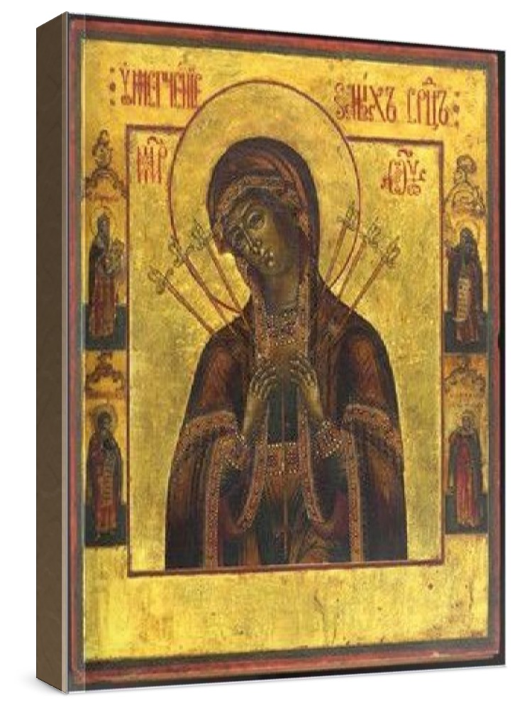 Икона умягчение злых сердец (копия старинной иконы). Изображение нанесено на основу из натурального хвойного дерева методом прямой печати. При работе соблюдены размерные пропорции и цветовая гамма оригинальной старинной иконы. Деревянная основа подвержена искусственному старению методом браширования, что делает икону более ценной и максимально похожей на многовековую семейную реликвию. Цена зависит от размера иконы (высота может незначительно отличаться от указанной величины в связи с точным соблюдением пропорций оригинала): 10x13 - 1500 руб. 30x40 - 5000 руб. 60x80 - 15000 руб. 15x18 - 2250 руб. 40x60 - 8000 руб. 80x120 - 20000 руб. 20x25 - 3000 руб.