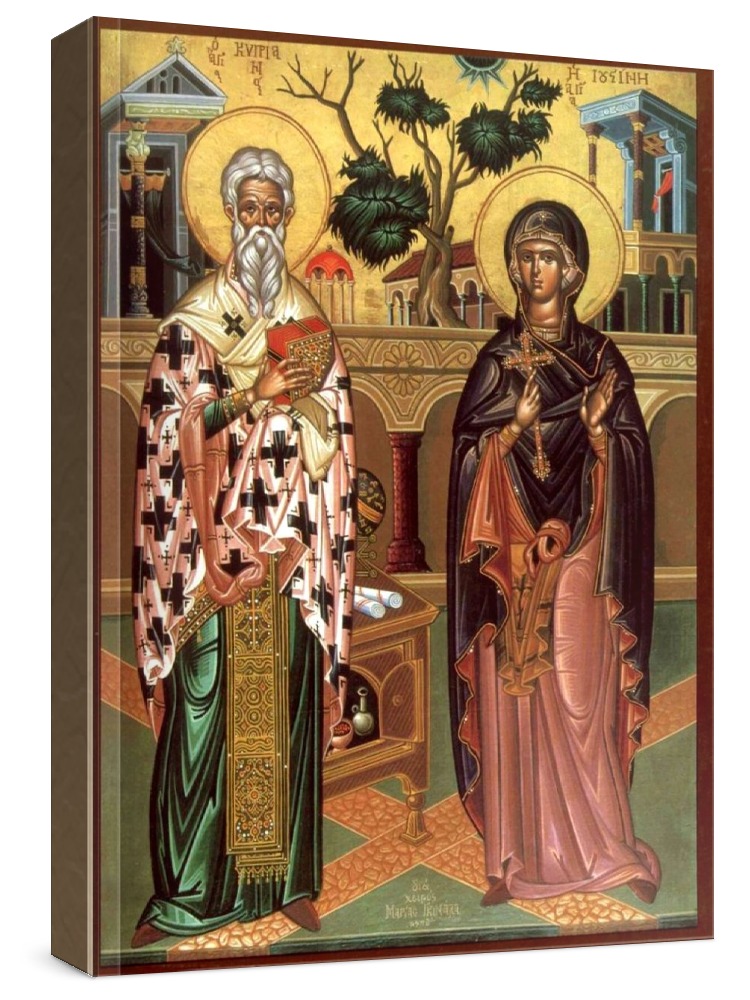 Икона киприан и иустина (копия старинной иконы). Изображение нанесено на основу из натурального хвойного дерева методом прямой печати. При работе соблюдены размерные пропорции и цветовая гамма оригинальной старинной иконы. Деревянная основа подвержена искусственному старению методом браширования, что делает икону более ценной и максимально похожей на многовековую семейную реликвию. Цена зависит от размера иконы (высота может незначительно отличаться от указанной величины в связи с точным соблюдением пропорций оригинала): 10x13 - 1500 руб. 30x40 - 5000 руб. 60x80 - 15000 руб. 15x18 - 2250 руб. 40x60 - 8000 руб. 80x120 - 20000 руб. 20x25 - 3000 руб.