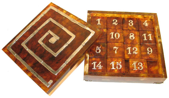 Сувенир "игра пятнашки". Состав: янтарь натуральный, серебро 875 пр., подкладка - кожа. Вес серебра в изделии - 16,85 гр. Высота: 2 см, ширина - 9 см, глубина - 9 см. На крышку возможно нанесение любого изображения в серебре, по желанию заказчика. Поставляется в подарочном футляре. В случае отсутствия товара на складе, срок изготовления - от трех недель.