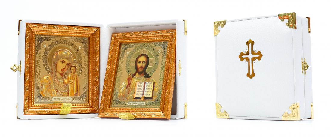 Икона складень казанская-спаситель (белая кожа)