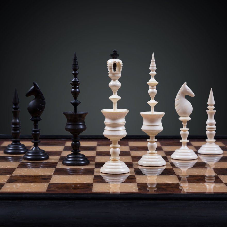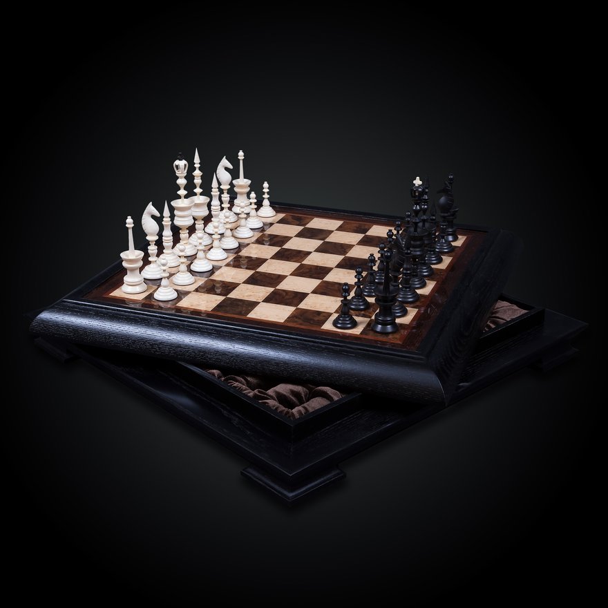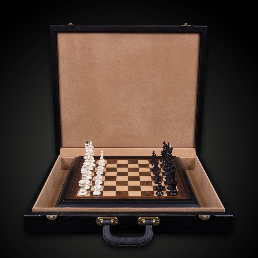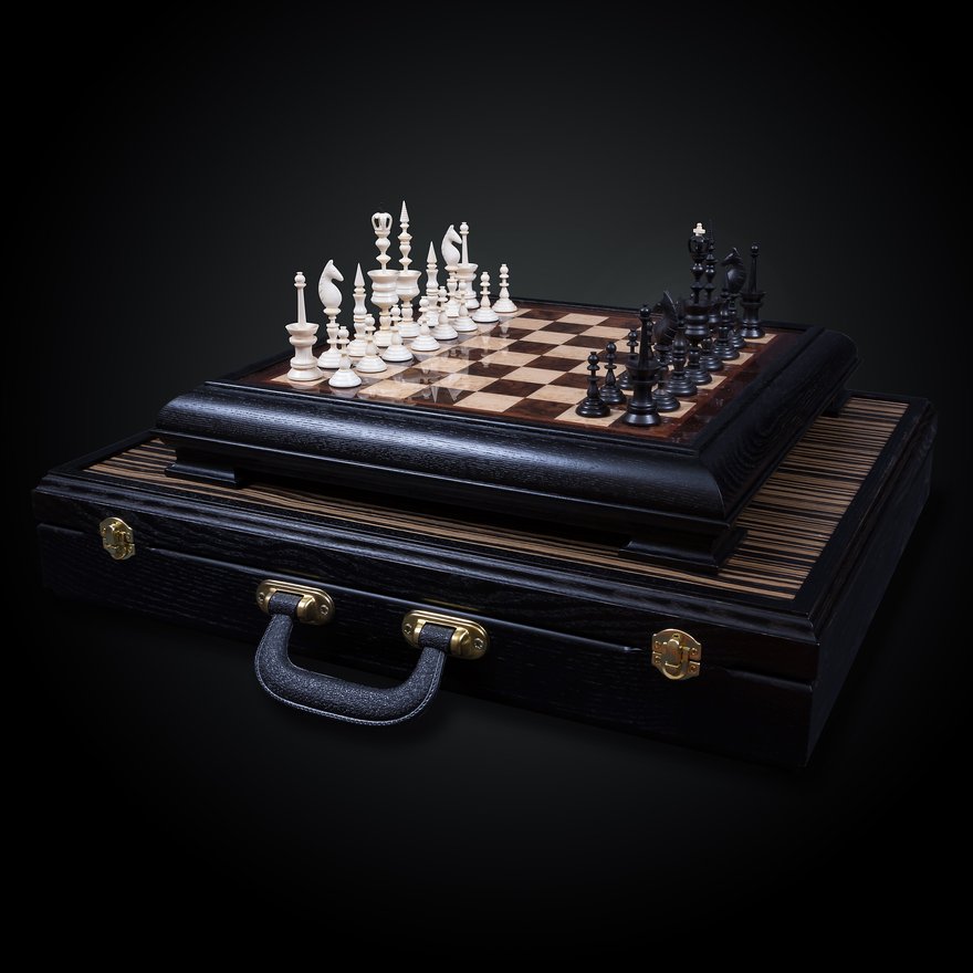 Шахматы селенус из бивня мамонта kadun. На страницу шахмат из бивня мамонта Шахматные фигуры в стиле Селенус Светлые – бивень мамонта, темные – африканский эбен ( черное железное дерево). Высота фигуры и диаметр подставки Король 10,5 / 3,5 см. Пешка 4 / 2,5 см. Шахматная доска Размеры 44 / 44 / 7 см, клетка 4 см. , ножки подклеены тканью, Каркас - массив африканского венге , клетка темная – корень ореха, клетка светлая – клен птичий глаз, внутри мягкий ложемент с ячейками для каждой фигуры, отделка шахматного поля рояльным лаком. Кейс ручной работы. Вес с кейсом 12 кг.