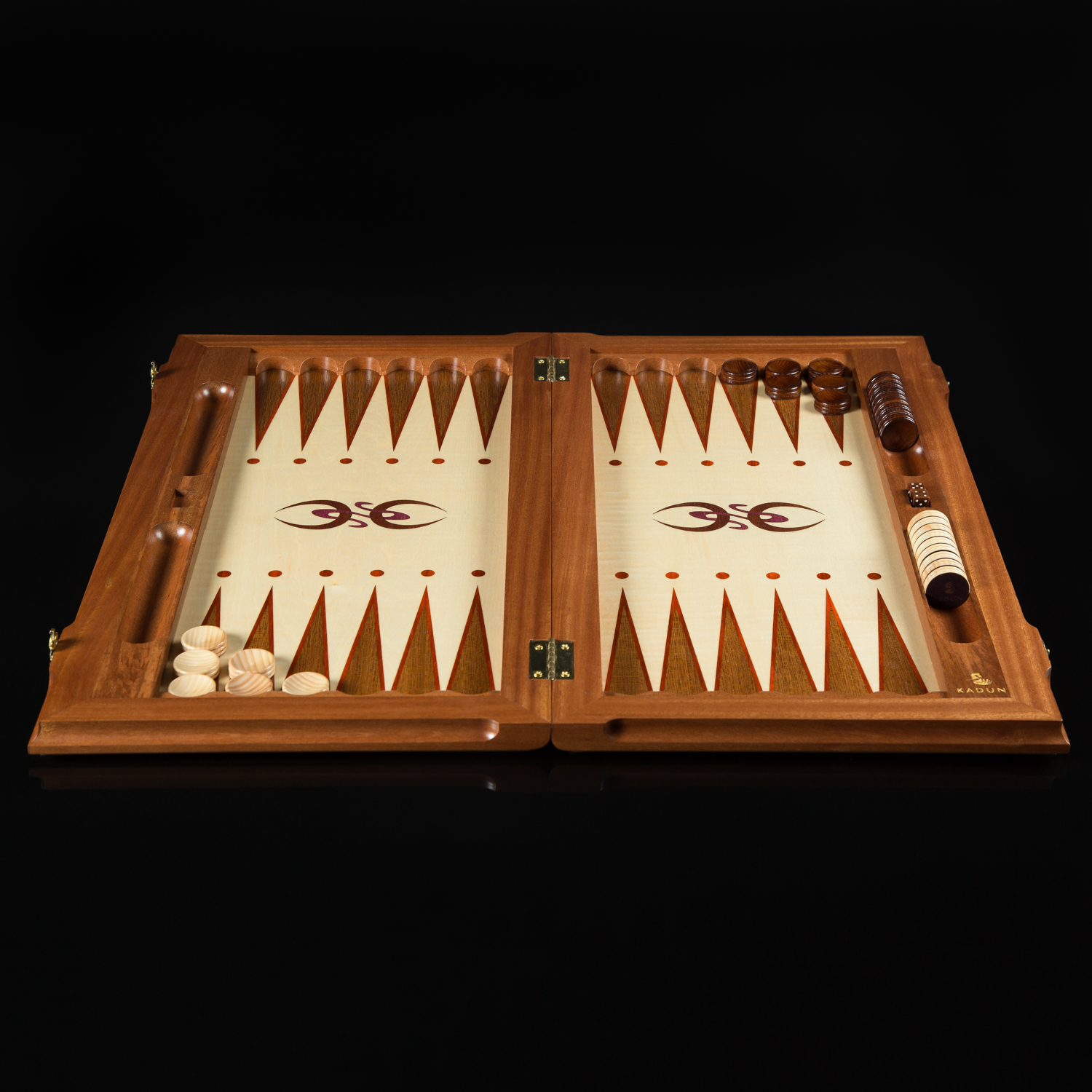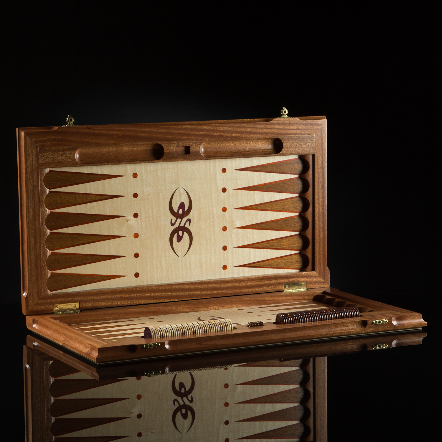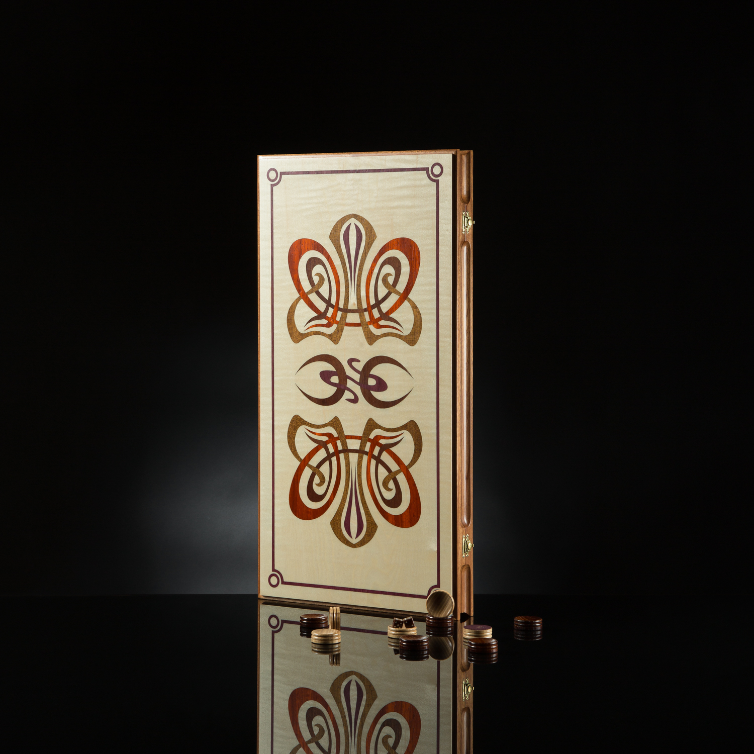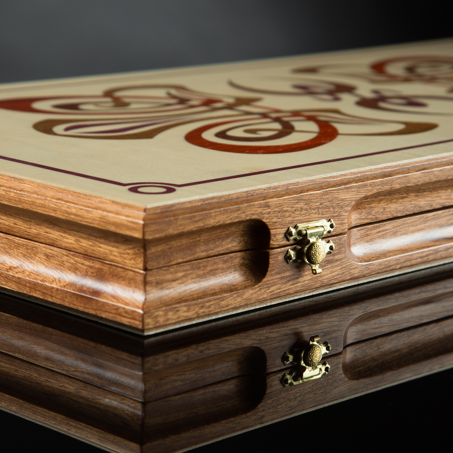 Нарды "серебряный век" kadun. Конструкция доски с баром для шашек корпус - сапеле, рисунок в технике маркетри( мозаика ) лицевая сторона – клен сикамора, ироко, амарант, сапеле, падук отделка - шелковисто-матовый лак поле внутри - клен сикамора, амарант, ироко, падук шашки светлые - ясень, темные - ясень тонировка, подклеены сувенирным замшем. кубики - обсидиан Размеры в сложенном виде длина 51см ширина 27см шашки ручной работы диаметром 26мм 30шт кубики грань 11мм 2шт Комплектация Нарды, шашки, кубики, подарочная упаковка из натурального льна ручной работы.