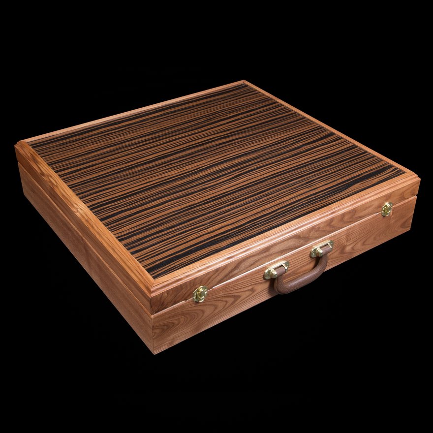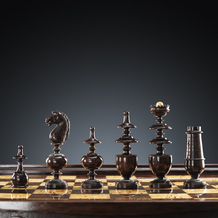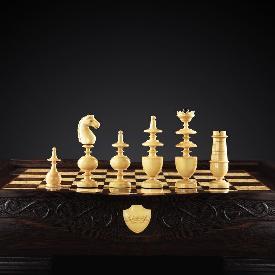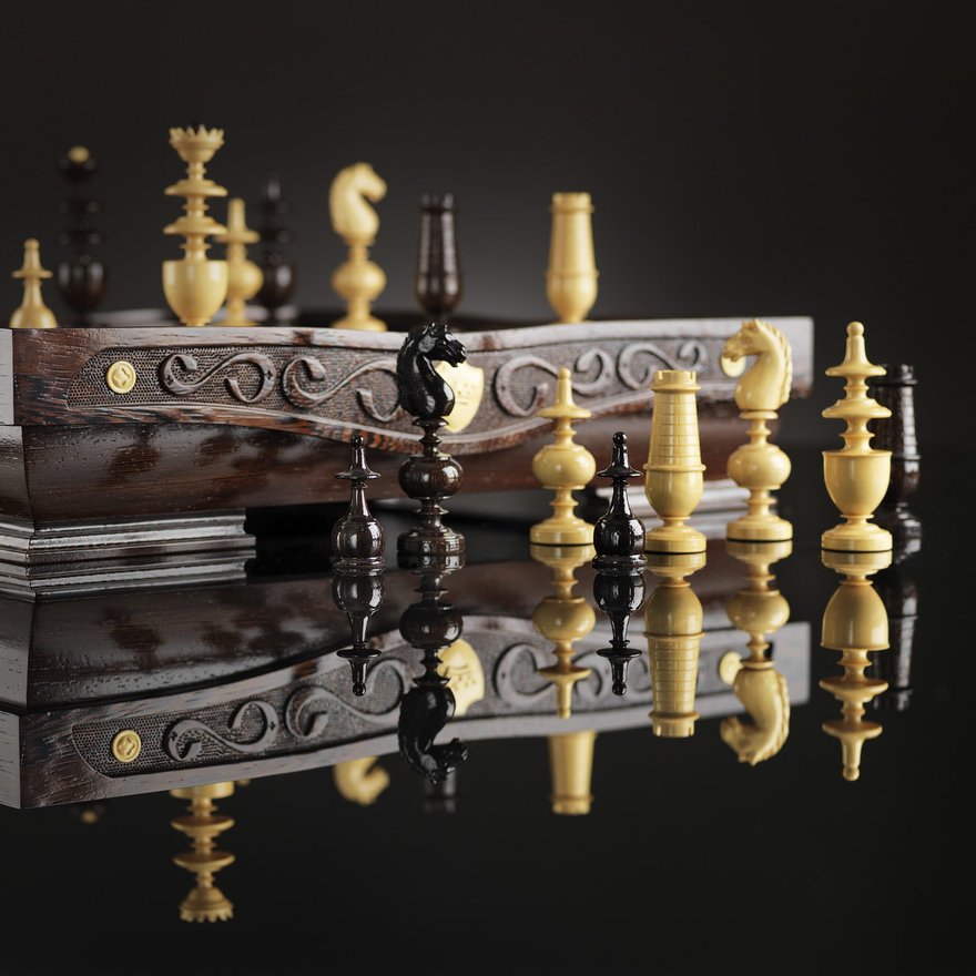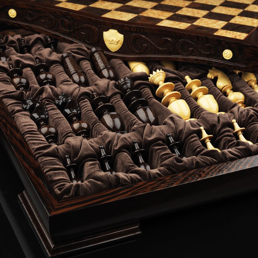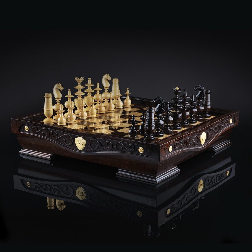 Шахматы режанс из венге kadun. Фигуры Режанс фигуры светлые – колхидский самшит, глянцевый лак фигуры темные - африканский венге, глянцевый лак все с утяжелением, основания подклеены замшей. Шахматная доска шахматное поле - рояльный лак ( полиэфир ) клетка светлая – карельская береза клетка темная - корень ореха корпус - массив африканского дерева венге с резными вставками из самшита крышка поднимается, в нижней части мягкий глубокий ложемент из бархата с ячейками для каждой фигуры, ножки подклеены замшей. Кейс выполнен вручную из тонированного ясеня и красного дерева, матовый лак, крышка открывается и удерживается в вертикальном положении, внутри мягкий ложемент. Размеры король – высота 12см диаметр подставки 3,5см пешка – высота 6 диаметр подставки 2,5см доска – ширина 51см высота 11см клетка 5см кейс – ширина 60см толщина 14см