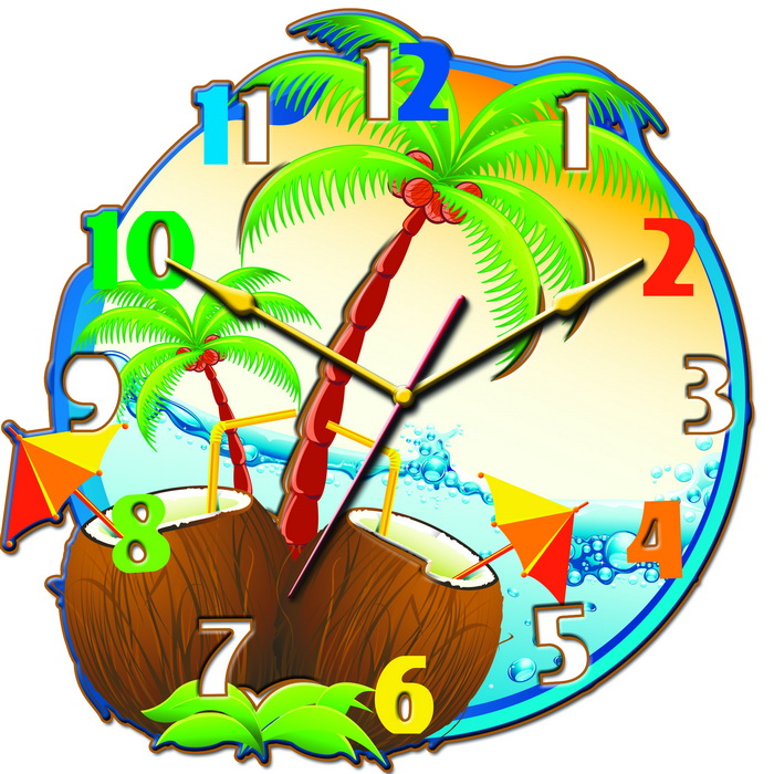 Корпус: часов выполнен из металла, арабские цифры. Часы круглые, на часах изображен пляж, море, пальмы, кокосы. Открытые, без стекла, не боятся влажной уборки. Отлично будут смотреться в виде дополнительного декора в доме
