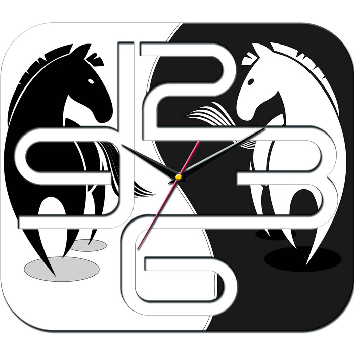 Корпус часов выполнен из металла, арабские цифры. Часы квадратной формы с черной и белой лошадками. Открытые, без стекла, не боятся влажной уборки. Отлично будут смотреться в виде дополнительного декора в доме, на кухне.