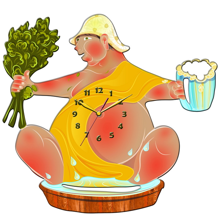 Корпус: часов выполнен из металла, арабские цифры. Часы в виде мужчины с веником и кружкой пива в бане. Открытые, без стекла, не боятся влажной уборки. Отлично будут смотреться в виде дополнительного декора в ванной комнате, даче, бане