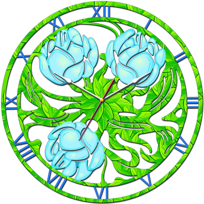 Корпус часов выполнен из металла, римские цифры. Часы круглые, на часах изображены голубые цветы. Открытые, без стекла, не боятся влажной уборки. Отлично будут смотреться в виде дополнительного декора в доме, в детской комнате.