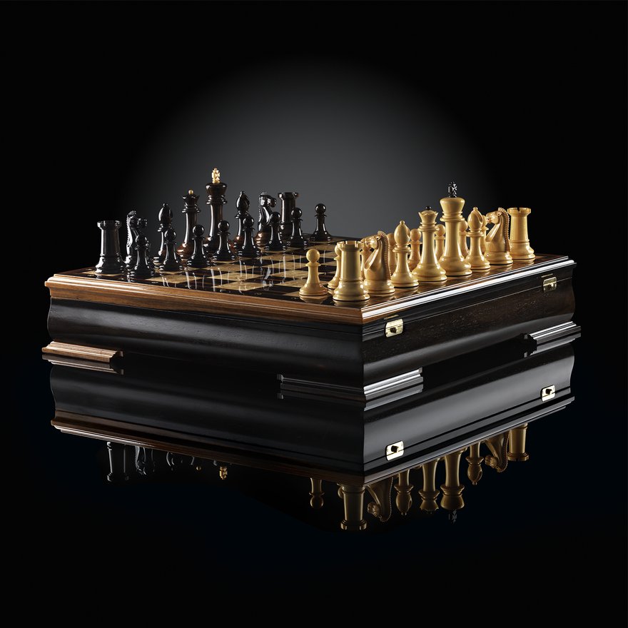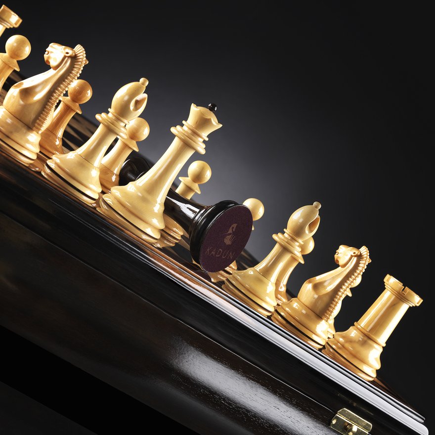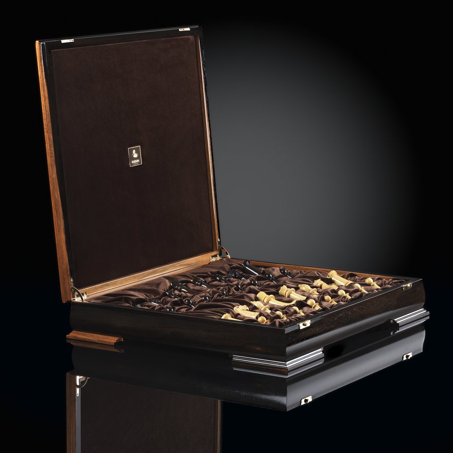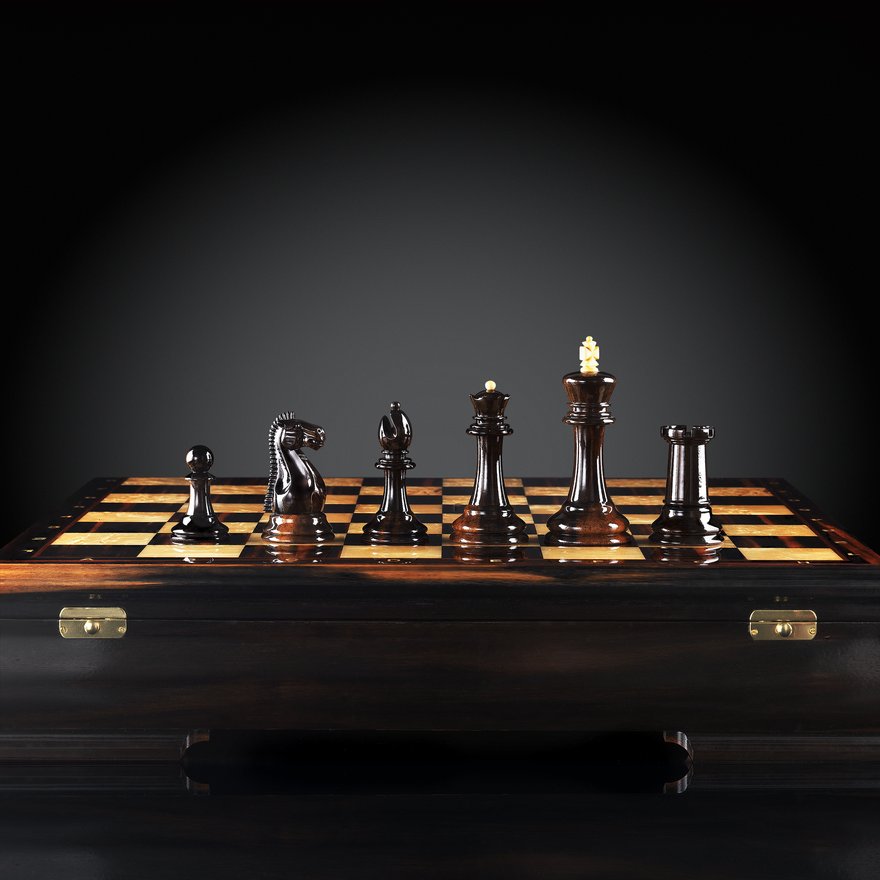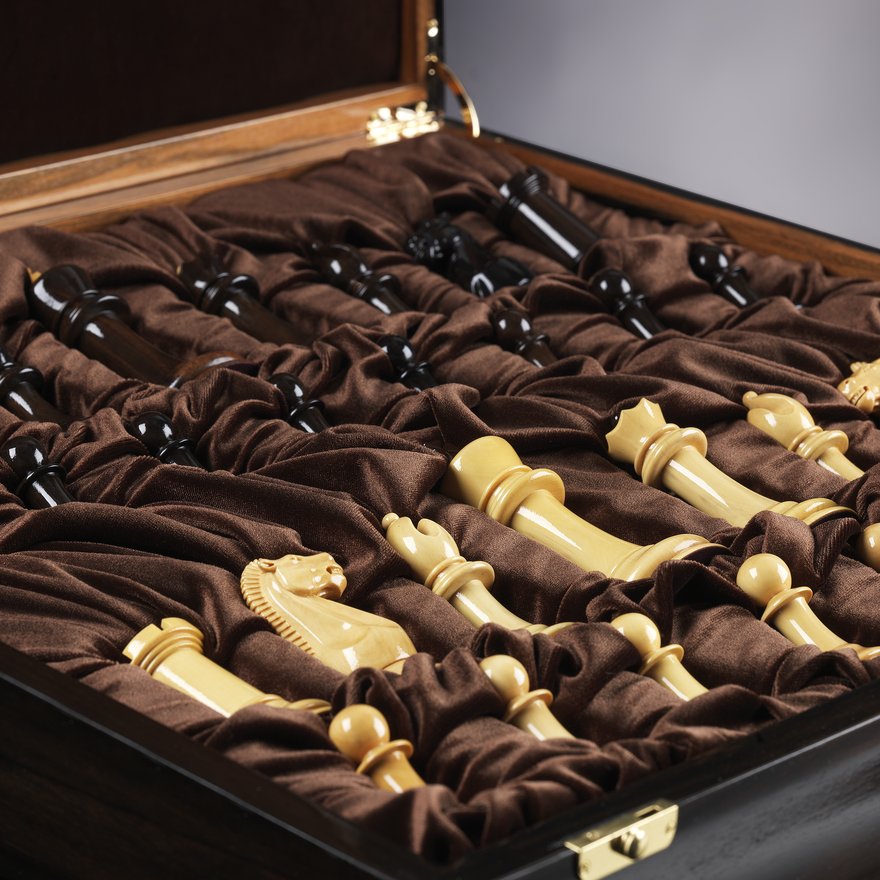 Шахматы стаунтон люкс (макассар/самшит), kadun 51х51. Раздел шахмат Стаунтон Фигуры Стаунтон фигуры светлые – колхидский самшит, глянцевый лак фигуры темные - макассар, глянцевый лак все с утяжелением, основания подклеены замшем. Шахматная доска шахматное поле - рояльный лак ( полиэфир ) клетка светлая – карельская береза клетка темная - корень ореха буквы – клен птичий глаз корпус - массив макассар мягкий глубокий ложемент из бархата с ячейками для каждой фигуры, крышка открывается и удерживается в вертикальном положении петлями с ограничителем, ножки подклеены замшем. Кейс выполнен вручную из красного дерева, матовый лак, крышка открывается и удерживается в вертикальном положении, внутри мягкий ложемент. Размеры король – высота 11,5см диаметр подставки 5см пешка – высота 5,5см диаметр подставки 3см доска – ширина 51см высота 11см клетка 5,5см кейс – ширина 60см толщина 14см
