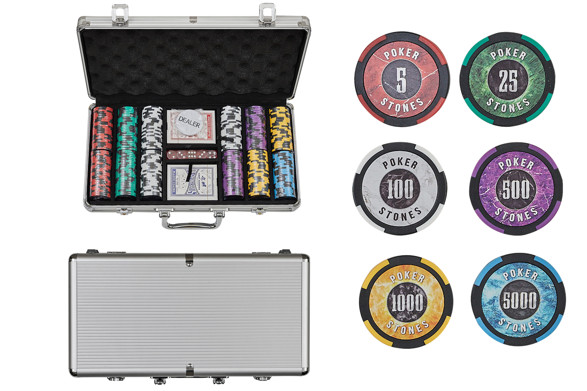 Главная особенность набора для покера Stones на 300 фишек заключается в том, что здесь нет фишек с номиналом 1 и 50, при этом номинал каждой последующей фишки (а всего их здесь 6 типов) в 5 раз больше предыдущей: классическая схема. Яркие фишки выполнены из прочного пластика. Они ребристые и фактурные, благодаря чему их удобно и приятно держать в руках.