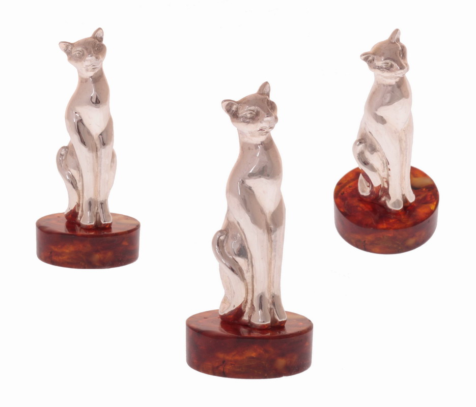 Сувенир "киса". Состав: янтарь, серебро 875 пробы или белая ювелирная бронза. Вес серебра в изделии - 48,00 гр. Размеры: высота - 7,00 см., диаметр янтарной подставки - 3,00 см. Поставляется в подарочном футляре. В случае отсутствия товара на складе срок изготовления от 3-х недель.