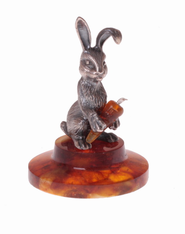 Сувенир "веселый кролик с морковкой". Состав: янтарь, серебро 875 пробы или белая ювелирная бронза. Вес серебра в изделии - 16,5 гр. Высота сувенира - 5,00 см, диаметр основания - 3,5 см. Поставляется в льняном мешочке с янтарной пуговицей. При отсутствии товара на складе, срок изготовления - от 3-х недель.