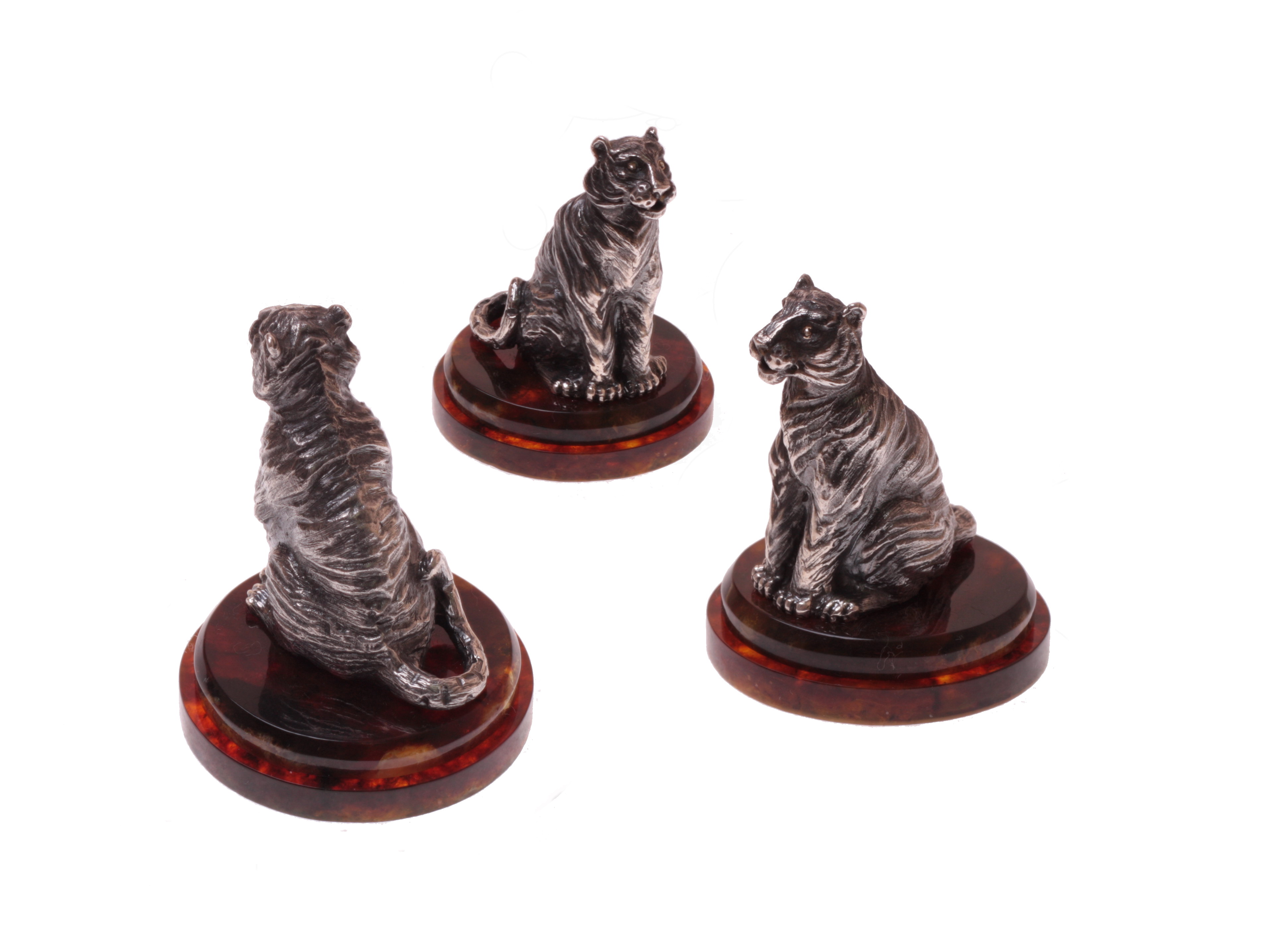 Сувенир "сидящий тигр" из янтаря. Состав: янтарь, серебро 875 пробы. Вес серебра в изделии - 59 гр. Диаметр постамента: 4,3 см. Высота (с постаментом): 5,5 см. Оттенок янтаря может отличаться от оттенка на фотографии. Поставляется в подарочном футляре. При отсутствии товара на складе срок изготовления от 3 недель.