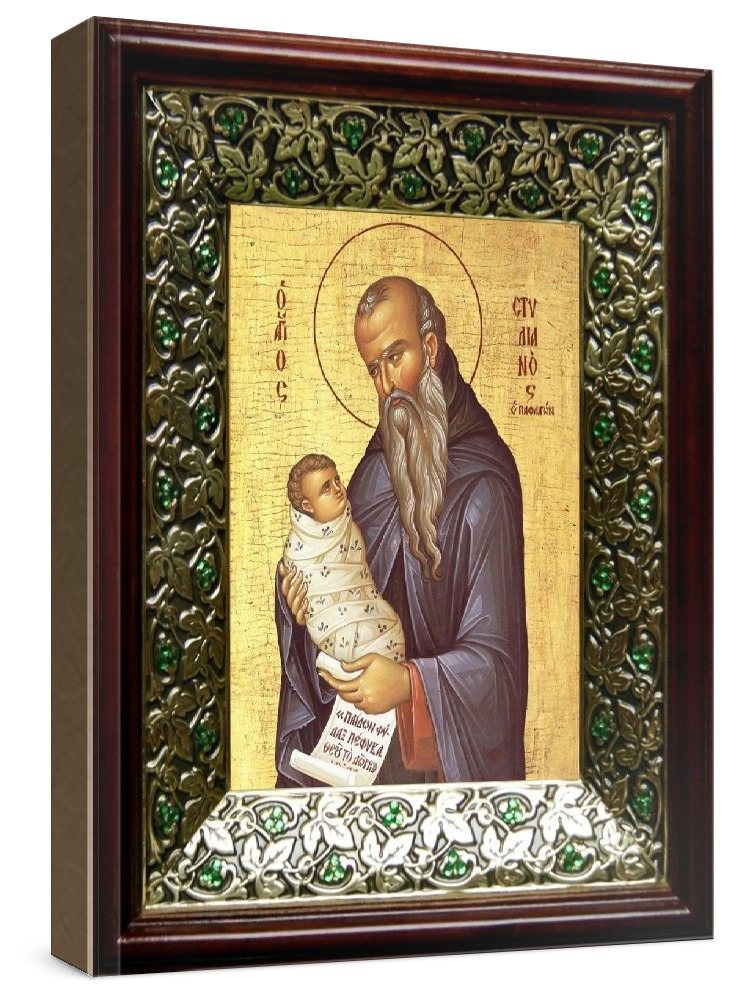 Икона стилиан пафлагонский (21х24), киот со стразами. Икона выполняется на заказ. Срок изготовления - 5-10 дней. Лик нанесен методом шелкографии на цельную липовую доску, покрытую левкасом (специальным грунтом под живопись). Использованы минеральные (природные) краски. Размер иконы без киота (см): 13х16, с киотом: 21х24. Киот (рамка) выполнен из березы и украшен басмой со стразами (узор из черненой меди в виде виноградной лозы). Икона освящена.