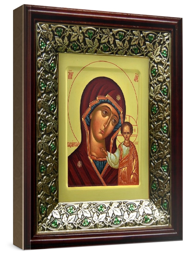 Казанская икона бм (21х24), киот со стразами. Икона выполняется на заказ. Срок изготовления - 5-10 дней. Лик нанесен методом шелкографии на цельную липовую доску, покрытую левкасом (специальным грунтом под живопись). Использованы минеральные (природные) краски. Размер иконы без киота (см): 13х16, с киотом: 21х24. Киот (рамка) выполнен из березы и украшен басмой со стразами (узор из черненой меди в виде виноградной лозы). Икона освящена.