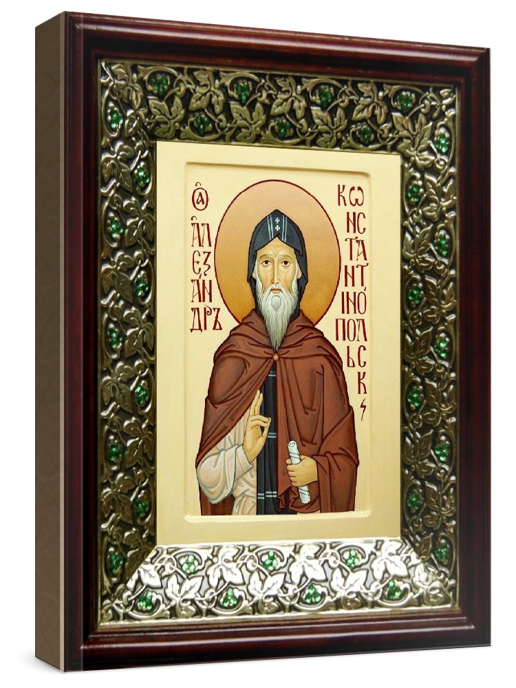 Икона александр константинопольский (21х24), киот со стразами. Икона выполняется на заказ. Срок изготовления - 3-7 дней. Лик нанесен методом шелкографии на цельную липовую доску, покрытую левкасом (специальным грунтом под живопись). Использованы минеральные (природные) краски. Размер иконы без киота (см): 13х16, с киотом: 21х24. Киот (рамка) выполнен из березы и украшен басмой со стразами (узор из черненой меди в виде лозы). Икона освящена.