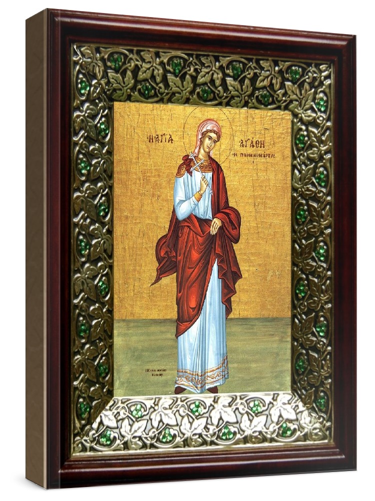 Икона агафия панормская (21х24), киот со стразами. Икона выполняется на заказ. Срок изготовления - 3-7 дней. Лик нанесен методом шелкографии на цельную липовую доску, покрытую левкасом (специальным грунтом под живопись). Использованы минеральные (природные) краски. Размер иконы без киота (см): 13х16, с киотом: 21х24. Киот (рамка) выполнен из березы и украшен басмой со стразами (узор из черненой меди в виде лозы). Икона освящена.
