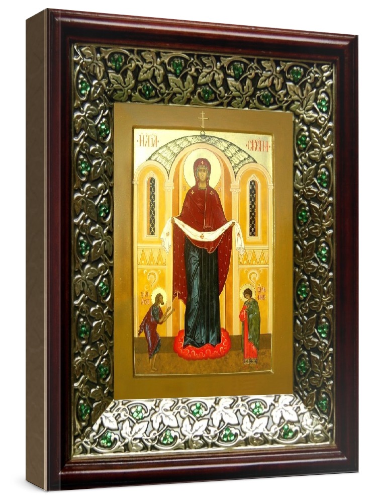 Икона покров пресвятой богородицы (21х24), киот со стразами. Икона выполняется на заказ. Срок изготовления - 3-7 дней. Лик нанесен методом шелкографии на цельную липовую доску, покрытую левкасом (специальным грунтом под живопись). Использованы минеральные (природные) краски. Размер иконы без киота (см): 13х16, с киотом: 21х24. Киот (рамка) выполнен из березы и украшен басмой со стразами (узор из черненой меди в виде лозы). Икона освящена.