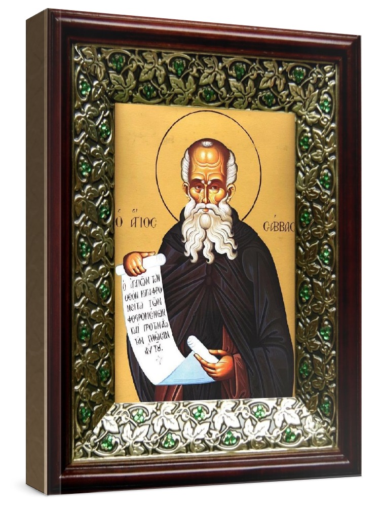 Икона савва освященный (21х24), киот со стразами. Икона выполняется на заказ. Срок изготовления - 3-7 дней. Лик нанесен методом шелкографии на цельную липовую доску, покрытую левкасом (специальным грунтом под живопись). Использованы минеральные (природные) краски. Размер иконы без киота (см): 13х16, с киотом: 21х24. Киот (рамка) выполнен из березы и украшен басмой со стразами (узор из черненой меди в виде лозы). Икона освящена.