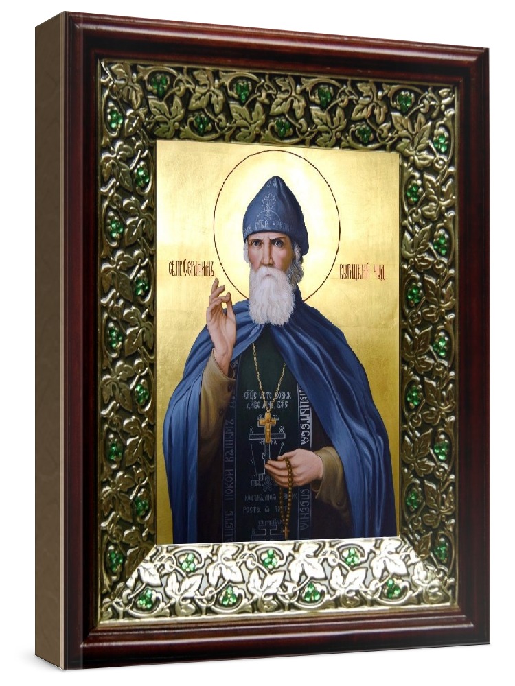 Икона серафим вырицкий (21х24), киот со стразами. Икона выполняется на заказ. Срок изготовления - 2-5 дней. Лик нанесен методом шелкографии на цельную липовую доску, покрытую левкасом (специальным грунтом под живопись). Использованы минеральные (природные) краски. Размер иконы без киота (см): 13х16, с киотом: 21х24. Киот (рамка) выполнен из березы и украшен басмой со стразами (узор из черненой меди в виде лозы). Икона освящена.