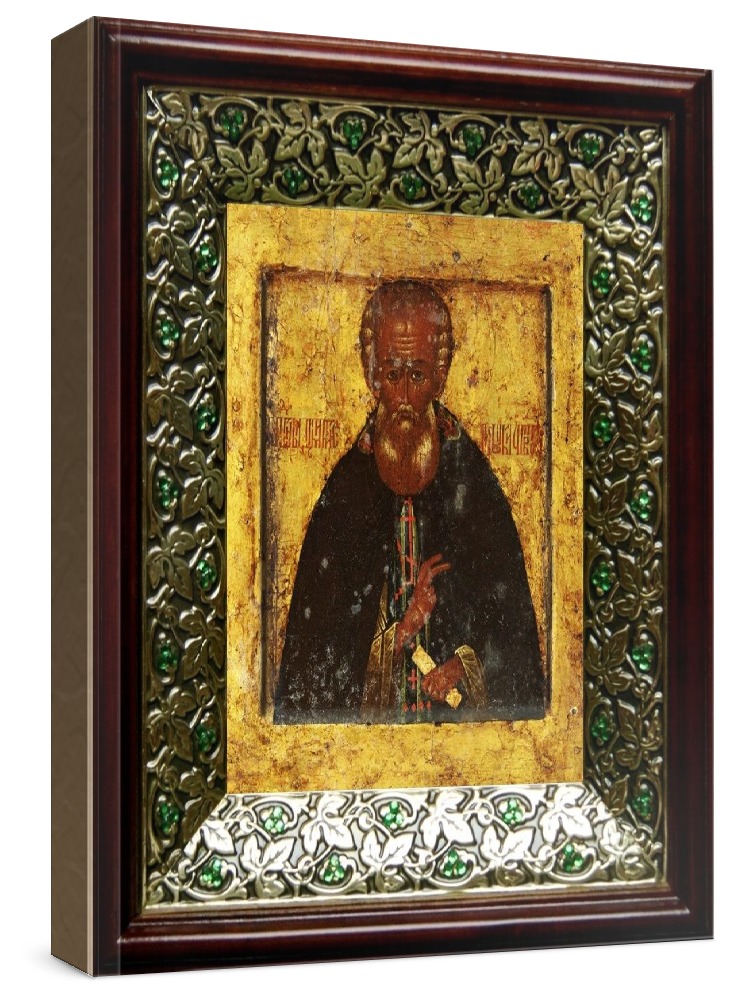 Икона димитрий прилуцкий (21х24), киот со стразами. Икона выполняется на заказ. Срок изготовления - 2-5 дней. Лик нанесен методом шелкографии на цельную липовую доску, покрытую левкасом (специальным грунтом под живопись). Использованы минеральные (природные) краски. Размер иконы без киота (см): 13х16, с киотом: 21х24. Киот (рамка) выполнен из березы и украшен басмой со стразами (узор из черненой меди в виде лозы). Икона освящена.