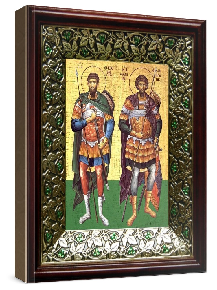 Икона феодор стратилат и феодор тирон (21х24), киот со стразами. Икона выполняется на заказ. Срок изготовления - 2-5 дней. Лик нанесен методом шелкографии на цельную липовую доску, покрытую левкасом (специальным грунтом под живопись). Использованы минеральные (природные) краски. Размер иконы без киота (см): 13х16, с киотом: 21х24. Киот (рамка) выполнен из березы и украшен басмой со стразами (узор из черненой меди в виде лозы). Икона освящена.