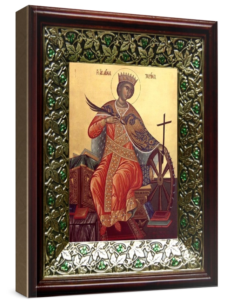 Икона екатерина александрийская (21х24), киот со стразами. Икона выполняется на заказ. Срок изготовления - 2-5 дней. Лик нанесен методом шелкографии на цельную липовую доску, покрытую левкасом (специальным грунтом под живопись). Использованы минеральные (природные) краски. Размер иконы без киота (см): 13х16, с киотом: 21х24. Киот (рамка) выполнен из березы и украшен басмой со стразами (узор из черненой меди в виде лозы). Икона освящена.