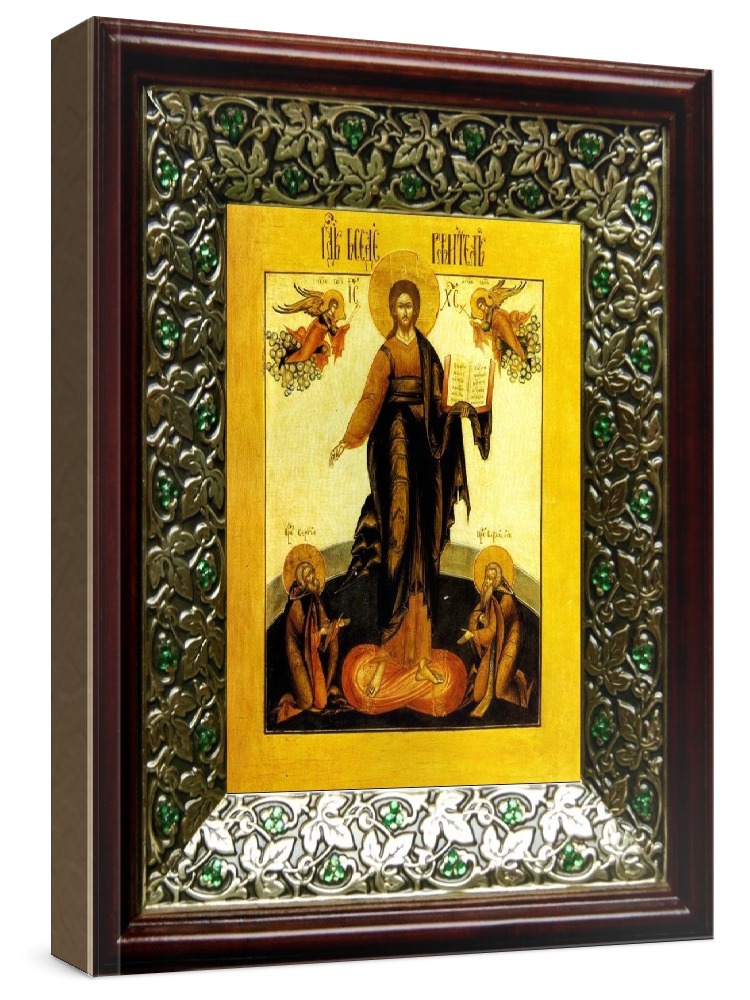 Икона спас смоленский (21х24), киот со стразами. Икона выполняется на заказ. Срок изготовления - 2-5 дней. Лик нанесен методом шелкографии на цельную липовую доску, покрытую левкасом (специальным грунтом под живопись). Использованы минеральные (природные) краски. Размер иконы без киота (см): 13х16, с киотом: 21х24. Киот (рамка) выполнен из березы и украшен басмой со стразами (узор из черненой меди в виде лозы). Икона освящена.