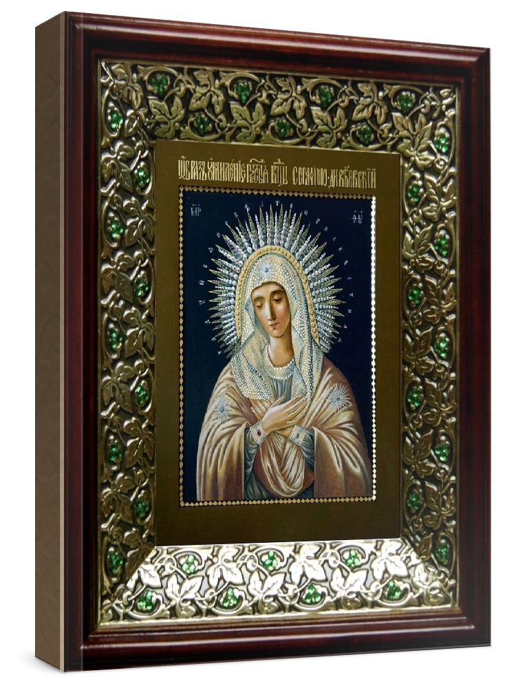Икона умиление серафимо-дивеевская (21х24), киот со стразами. Лик нанесен методом шелкографии на цельную липовую доску, покрытую левкасом (специальным грунтом под живопись). Использованы минеральные (природные) краски. Размер иконы без киота (см): 13х16, с киотом: 21х24. Киот со стеклом, выполнен из березы и украшен басмой со стразами (узор из черненой меди в виде лозы). Икона освящена.