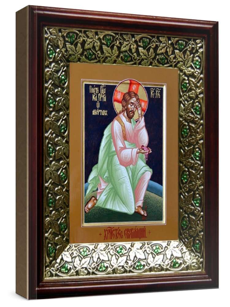 Икона плач иисуса христа об убиенных младенцах (21х24), киот со стразами. Лик нанесен методом шелкографии на цельную липовую доску, покрытую левкасом (специальным грунтом под живопись). Использованы минеральные (природные) краски. Размер иконы без киота (см): 13х16, с киотом: 21х24. Киот со стеклом, выполнен из березы и украшен басмой со стразами (узор из черненой меди в виде лозы). Икона освящена.
