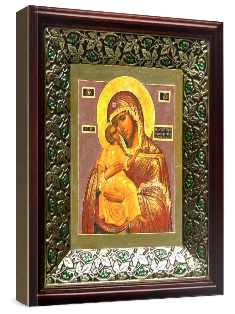 Икона взыграние младенца (21х24), киот со стразами. Лик нанесен методом шелкографии на цельную липовую доску, покрытую левкасом (специальным грунтом под живопись). Использованы минеральные (природные) краски. Размер иконы без киота (см): 13х16, с киотом: 21х24. Киот (рамка) выполнен из березы и украшен басмой со стразами (узор из черненой меди в виде виноградной лозы). Икона освящена.