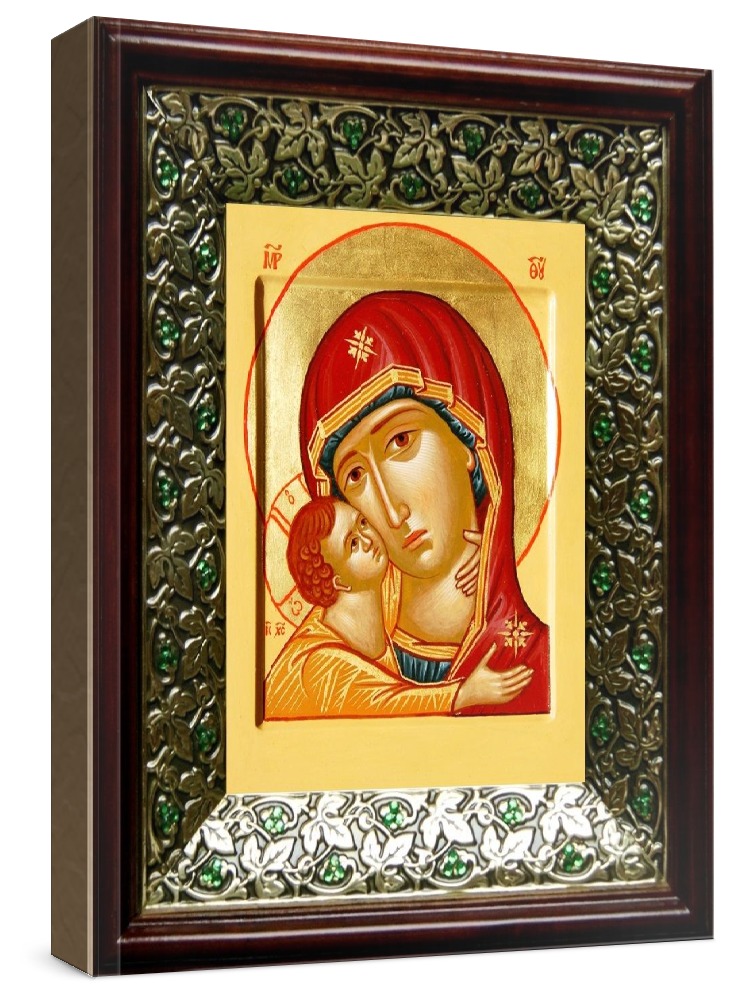 Игоревская икона бм (21х24), киот со стразами. Лик нанесен методом шелкографии на цельную липовую доску, покрытую левкасом (специальным грунтом под живопись). Использованы минеральные (природные) краски. Размер иконы без киота (см): 13х16, с киотом: 21х24. Киот (рамка) выполнен из березы и украшен басмой со стразами (узор из черненой меди в виде виноградной лозы). Икона освящена.