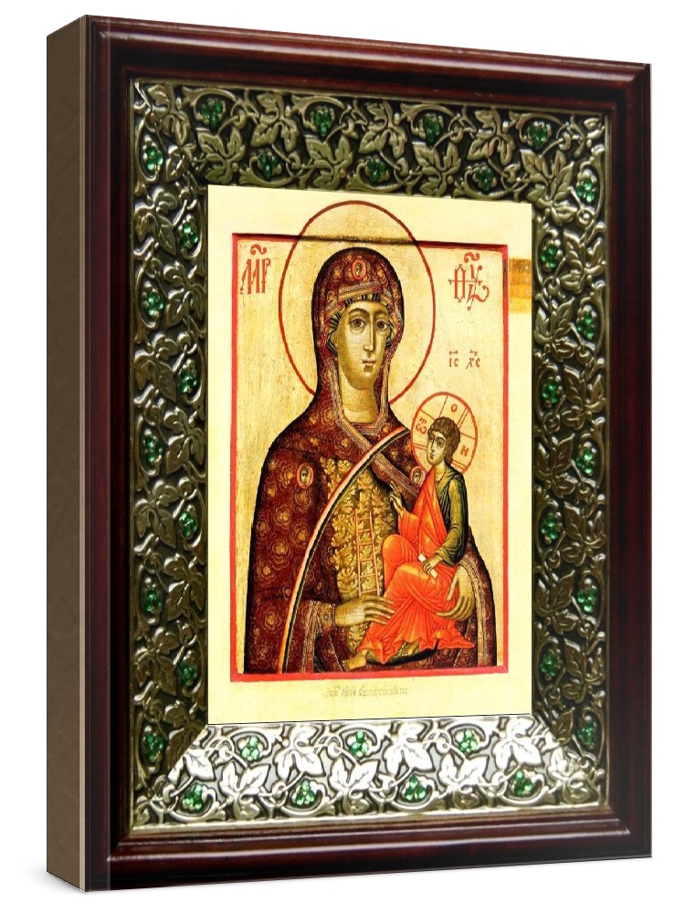Молченская икона бм (21х24), киот со стразами. Лик нанесен методом шелкографии на цельную липовую доску, покрытую левкасом (специальным грунтом под живопись). Использованы минеральные (природные) краски. Размер иконы без киота (см): 13х16, с киотом: 21х24. Киот со стеклом, выполнен из березы и украшен басмой со стразами (узор из черненой меди в виде лозы). Икона освящена.