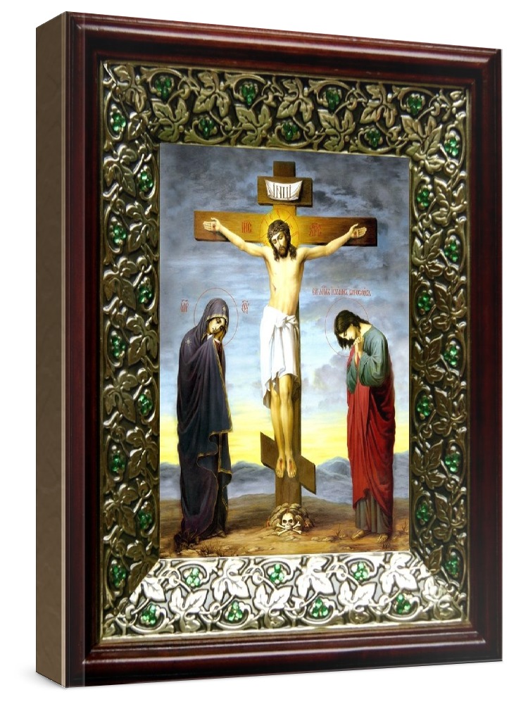 Икона распятие христа (21х24), киот со стразами. Лик нанесен методом шелкографии на цельную липовую доску, покрытую левкасом (специальным грунтом под живопись). Использованы минеральные (природные) краски. Размер иконы без киота (см): 13х16, с киотом: 21х24. Киот со стеклом, выполнен из березы и украшен басмой со стразами (узор из черненой меди в виде лозы). Икона освящена.