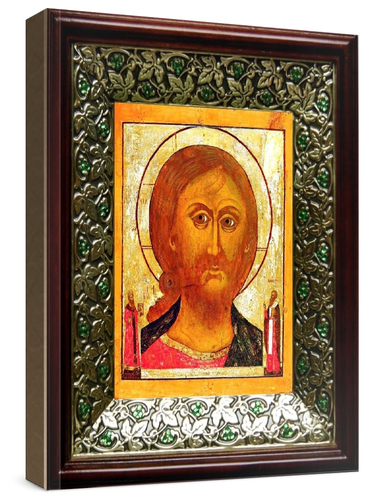 Икона спас ярое око (21х24), киот со стразами. Лик нанесен методом шелкографии на цельную липовую доску, покрытую левкасом (специальным грунтом под живопись). Использованы минеральные (природные) краски. Размер иконы без киота (см): 13х16, с киотом: 21х24. Киот со стеклом, выполнен из березы и украшен басмой со стразами (узор из черненой меди в виде лозы). Икона освящена.