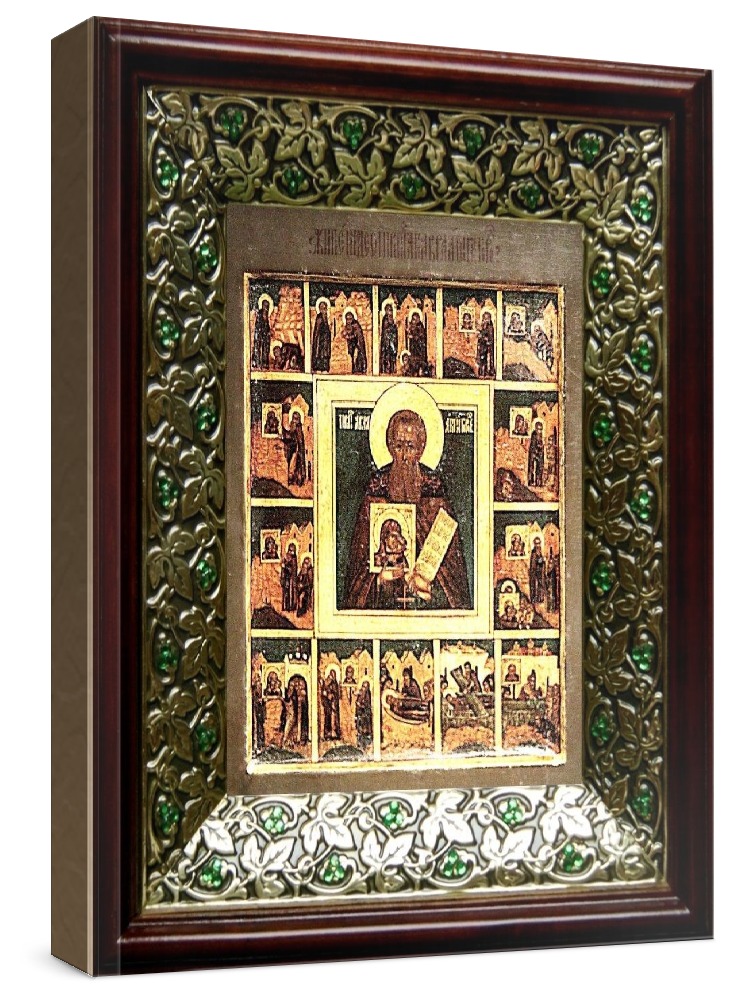 Икона авраамий галичский (21х24), киот со стразами. Лик нанесен методом шелкографии на цельную липовую доску, покрытую левкасом (специальным грунтом под живопись). Использованы минеральные (природные) краски. Размер иконы без киота (см): 13х16, с киотом: 21х24. Киот со стеклом, выполнен из березы и украшен басмой со стразами (узор из черненой меди в виде лозы). Икона освящена.