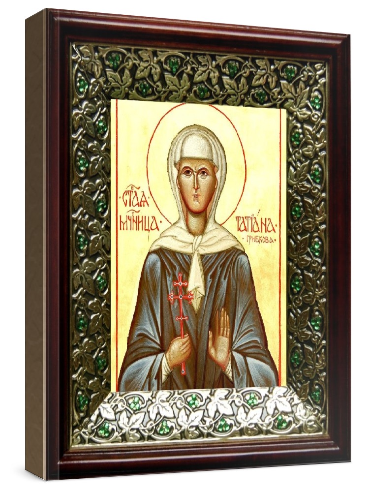 Икона татьяна грибкова (21х24), киот со стразами. Лик нанесен методом шелкографии на цельную липовую доску, покрытую левкасом (специальным грунтом под живопись). Использованы минеральные (природные) краски. Размер иконы без киота (см): 13х16, с киотом: 21х24. Киот со стеклом, выполнен из березы и украшен басмой со стразами (узор из черненой меди в виде лозы). Икона освящена.