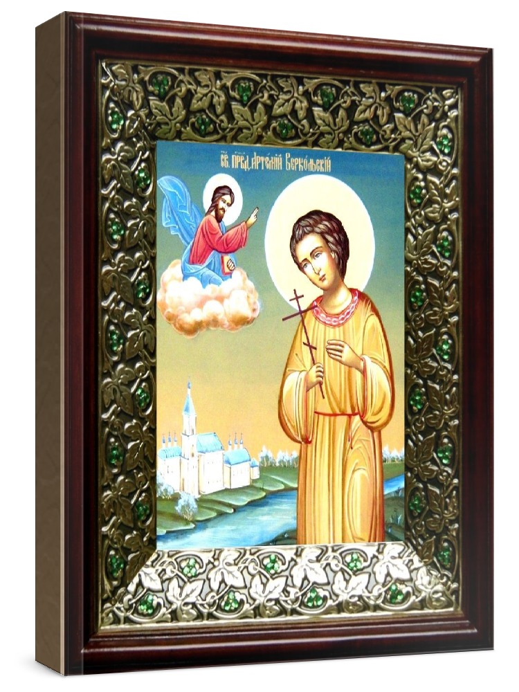 Икона артемий веркольский (21х24), киот со стразами. Лик нанесен методом шелкографии на цельную липовую доску, покрытую левкасом (специальным грунтом под живопись). Использованы минеральные (природные) краски. Размер иконы без киота (см): 13х16, с киотом: 21х24. Киот со стеклом, выполнен из березы и украшен басмой со стразами (узор из черненой меди в виде лозы). Икона освящена.