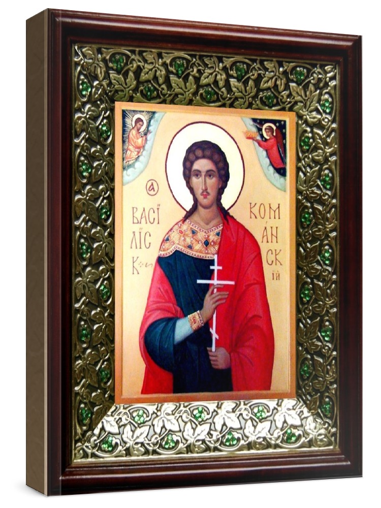 Икона василиск команский (21х24), киот со стразами. Лик нанесен методом шелкографии на цельную липовую доску, покрытую левкасом (специальным грунтом под живопись). Использованы минеральные (природные) краски. Размер иконы без киота (см): 13х16, с киотом: 21х24. Киот со стеклом, выполнен из березы и украшен басмой со стразами (узор из черненой меди в виде лозы). Икона освящена.
