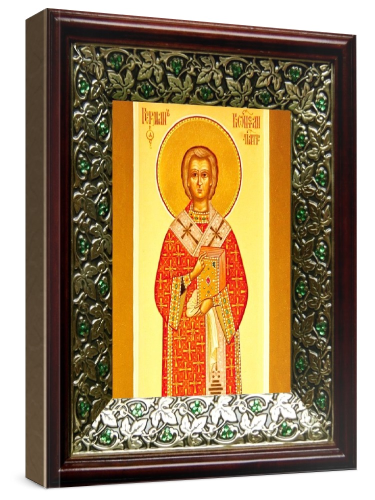 Икона герман константинопольский (21х24), киот со стразами. Лик нанесен методом шелкографии на цельную липовую доску, покрытую левкасом (специальным грунтом под живопись). Использованы минеральные (природные) краски. Размер иконы без киота (см): 13х16, с киотом: 21х24. Киот со стеклом, выполнен из березы и украшен басмой со стразами (узор из черненой меди в виде лозы). Икона освящена.