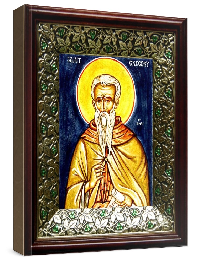 Икона григорий синаит (21х24), киот со стразами. Лик нанесен методом шелкографии на цельную липовую доску, покрытую левкасом (специальным грунтом под живопись). Использованы минеральные (природные) краски. Размер иконы без киота (см): 13х16, с киотом: 21х24. Киот со стеклом, выполнен из березы и украшен басмой со стразами (узор из черненой меди в виде лозы). Икона освящена.
