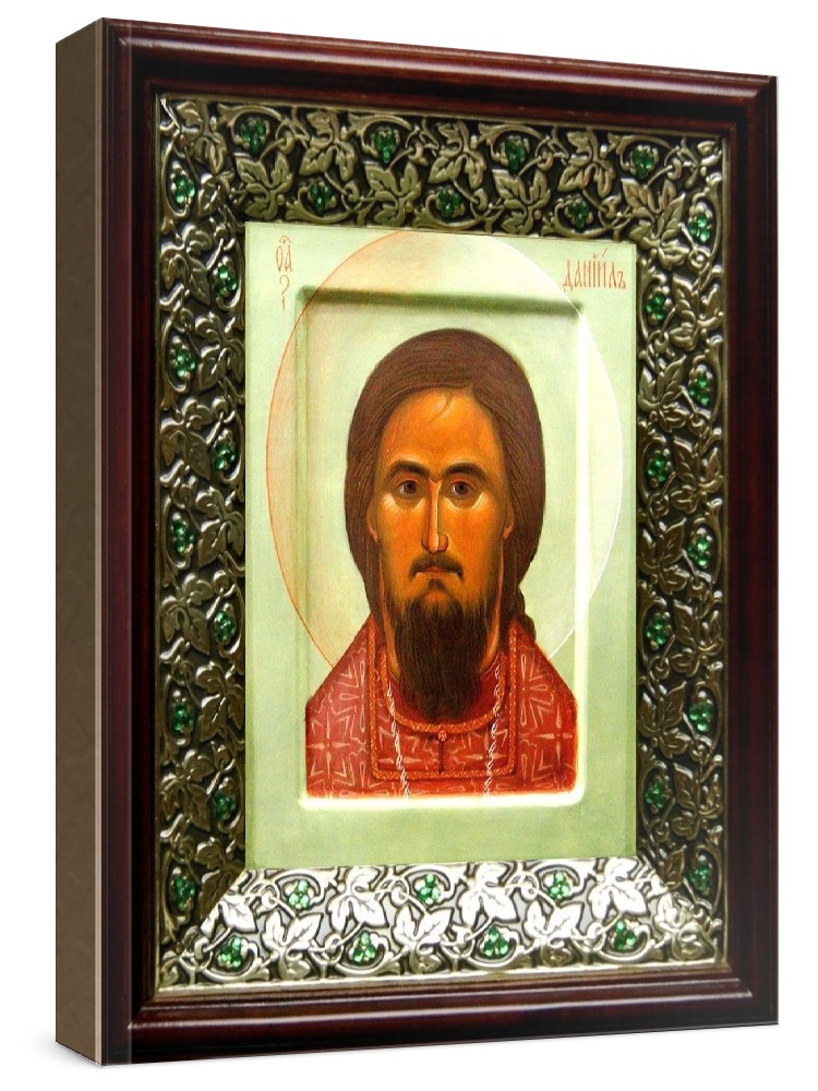 Икона даниил сысоев (21х24), киот со стразами. Лик нанесен методом шелкографии на цельную липовую доску, покрытую левкасом (специальным грунтом под живопись). Использованы минеральные (природные) краски. Размер иконы без киота (см): 13х16, с киотом: 21х24. Киот со стеклом, выполнен из березы и украшен басмой со стразами (узор из черненой меди в виде лозы). Икона освящена.