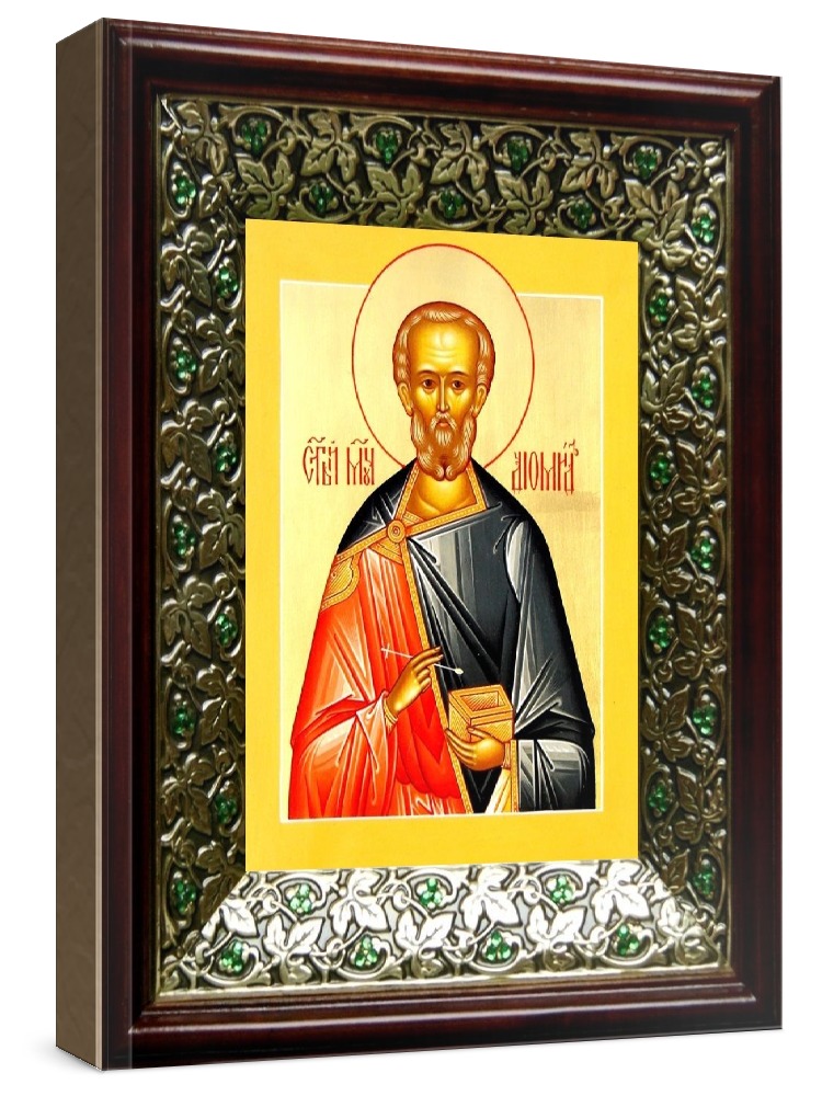 Икона диомид тарсянин (21х24), киот со стразами. Лик нанесен методом шелкографии на цельную липовую доску, покрытую левкасом (специальным грунтом под живопись). Использованы минеральные (природные) краски. Размер иконы без киота (см): 13х16, с киотом: 21х24. Киот со стеклом, выполнен из березы и украшен басмой со стразами (узор из черненой меди в виде лозы). Икона освящена.