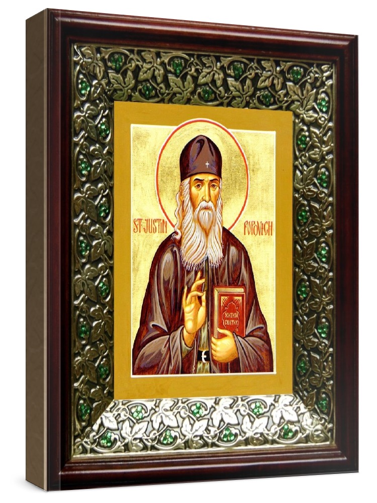 Икона иустин сербский (попович) (21х24), киот со стразами. Лик нанесен методом шелкографии на цельную липовую доску, покрытую левкасом (специальным грунтом под живопись). Использованы минеральные (природные) краски. Размер иконы без киота (см): 13х16, с киотом: 21х24. Киот со стеклом, выполнен из березы и украшен басмой со стразами (узор из черненой меди в виде лозы). Икона освящена.