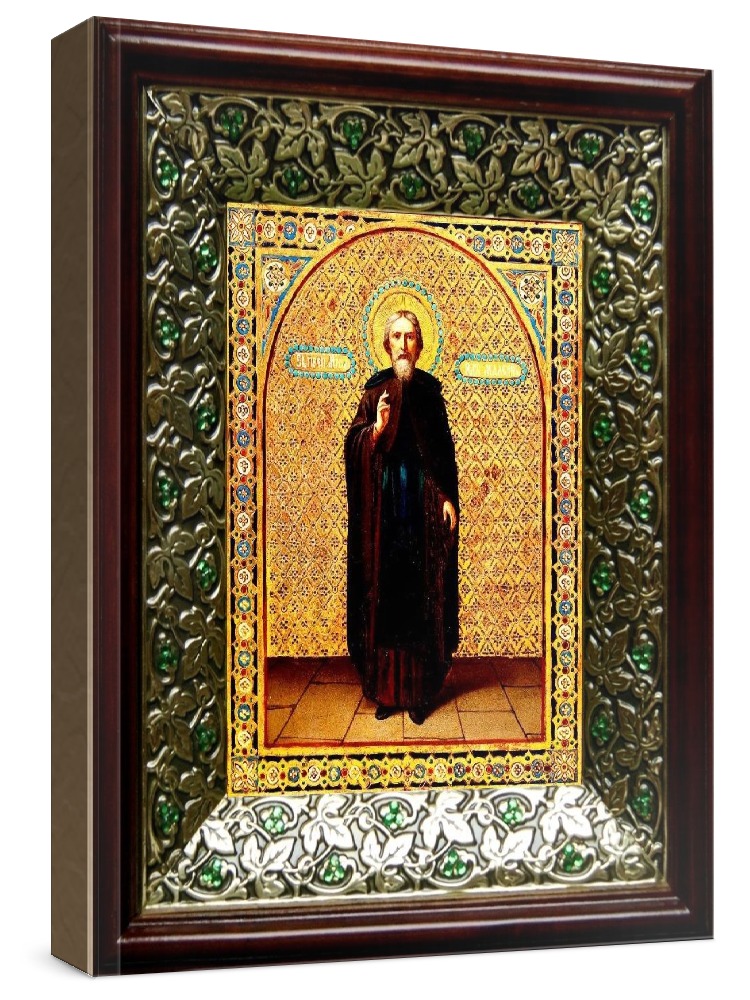 Икона михаил малеин (21х24), киот со стразами. Лик нанесен методом шелкографии на цельную липовую доску, покрытую левкасом (специальным грунтом под живопись). Использованы минеральные (природные) краски. Размер иконы без киота (см): 13х16, с киотом: 21х24. Киот со стеклом, выполнен из березы и украшен басмой со стразами (узор из черненой меди в виде лозы). Икона освящена.