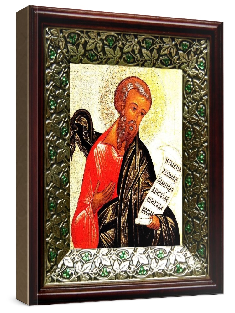Икона михей, пророк (21х24), киот со стразами. Лик нанесен методом шелкографии на цельную липовую доску, покрытую левкасом (специальным грунтом под живопись). Использованы минеральные (природные) краски. Размер иконы без киота (см): 13х16, с киотом: 21х24. Киот со стеклом, выполнен из березы и украшен басмой со стразами (узор из черненой меди в виде лозы). Икона освящена.