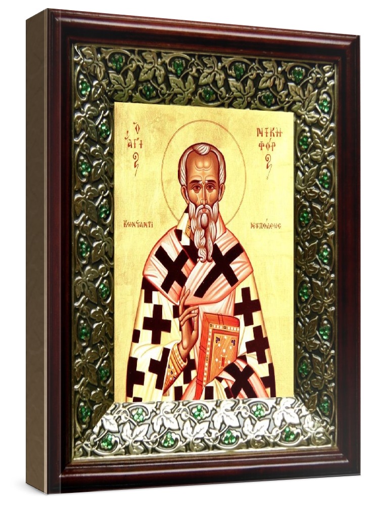 Икона никифор и геннадий важеозерские (21х24), киот со стразами. Лик нанесен методом шелкографии на цельную липовую доску, покрытую левкасом (специальным грунтом под живопись). Использованы минеральные (природные) краски. Размер иконы без киота (см): 13х16, с киотом: 21х24. Киот со стеклом, выполнен из березы и украшен басмой со стразами (узор из черненой меди в виде лозы). Икона освящена.